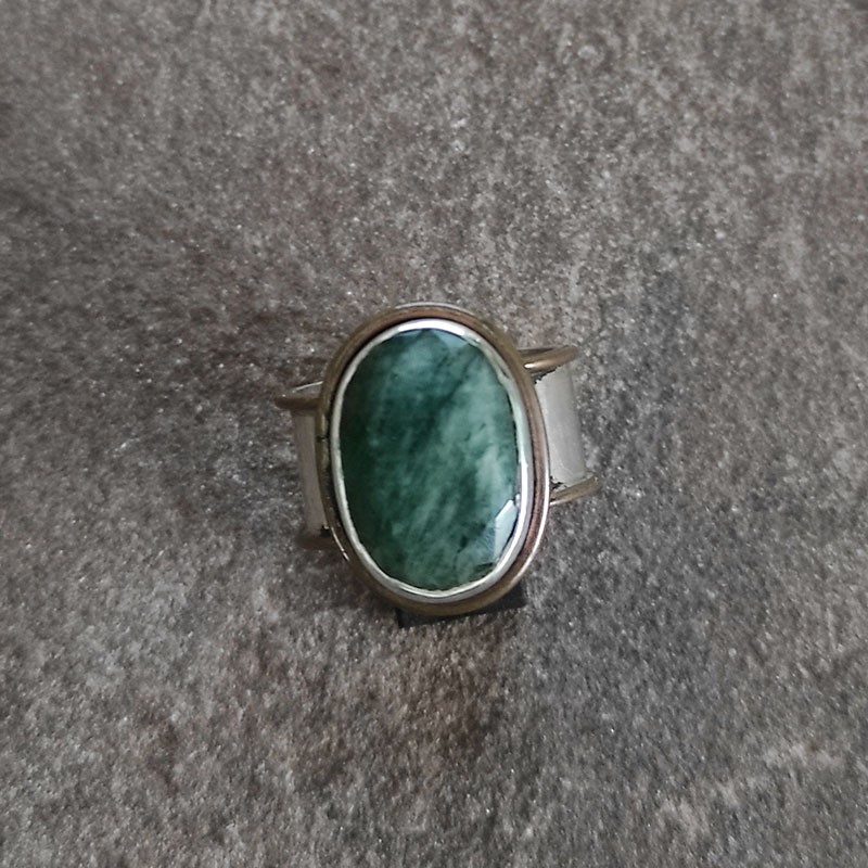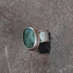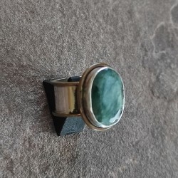 Anillo de Plata con Esmeralda de gran tamaño tallada y combinado con bordes de bronce.