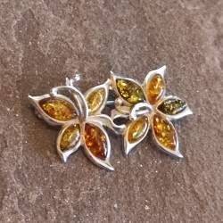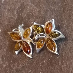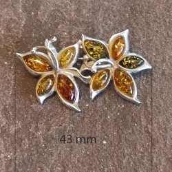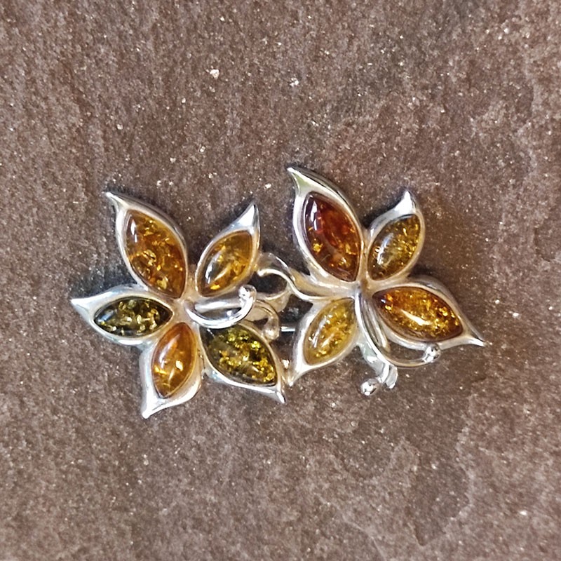 Broche de Plata con forma de dos hojas y Ámbar de color verde, miel y limón