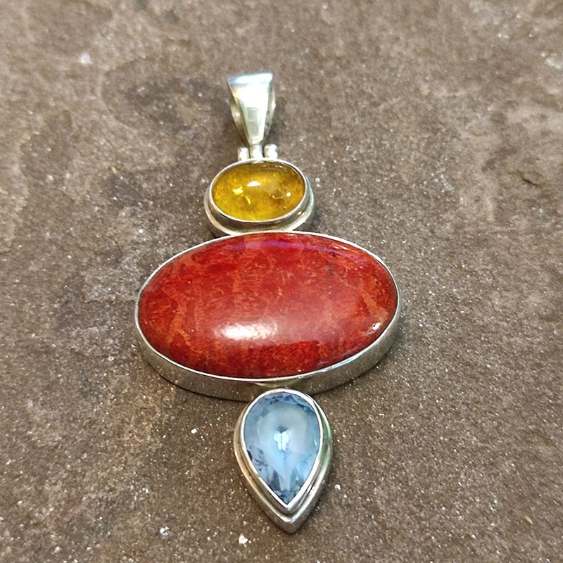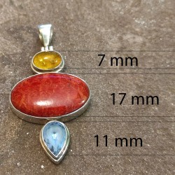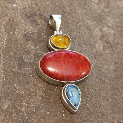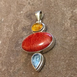 Colgante de Plata con Coral, Ámbar y Topacio azul