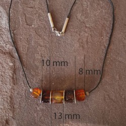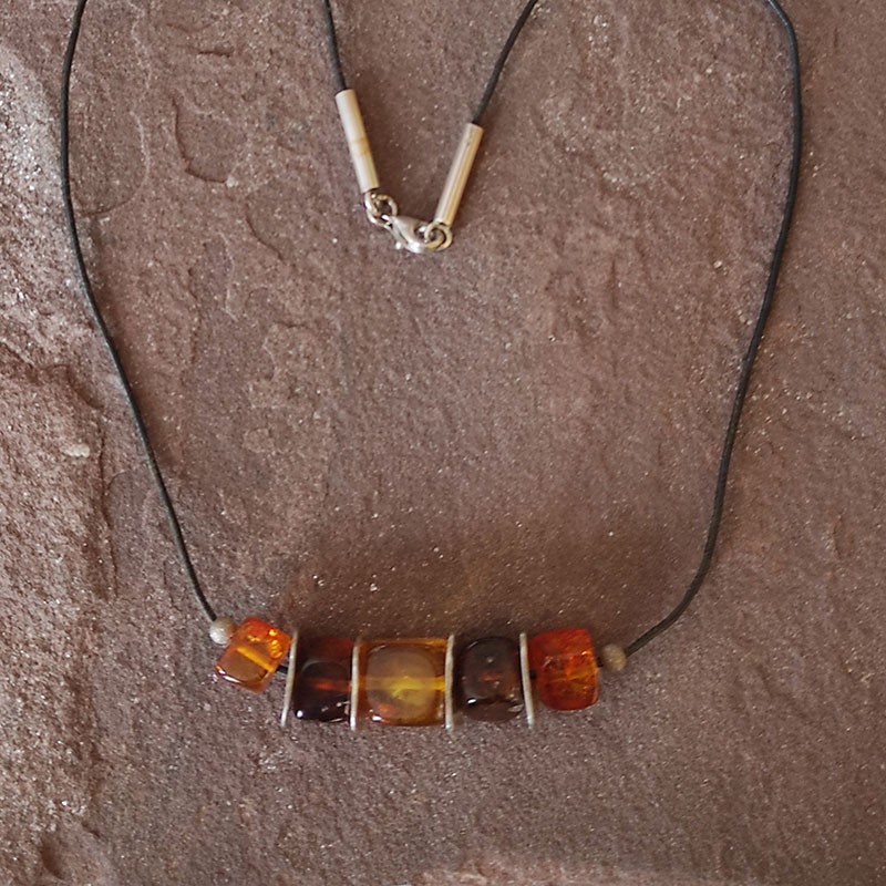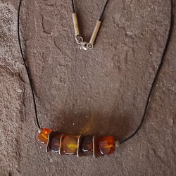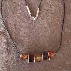 Collar de piel con cierre de Plata y un colgante con varias piezas de Ámbar y Plata