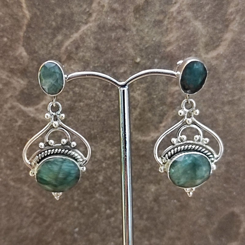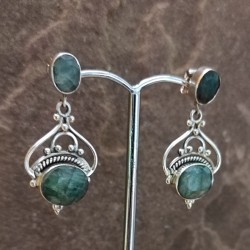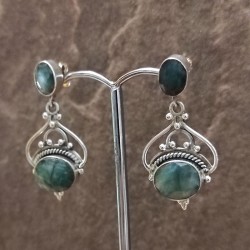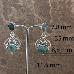Pendientes de Plata Largos Labrados con Esmeralda Ovalada Talladas