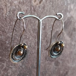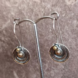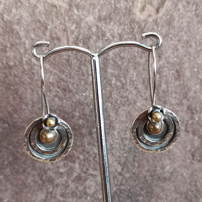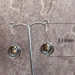 Pendientes de Plata lisa martillado, gancho fijo y combinado con bolas de bronce y cobre